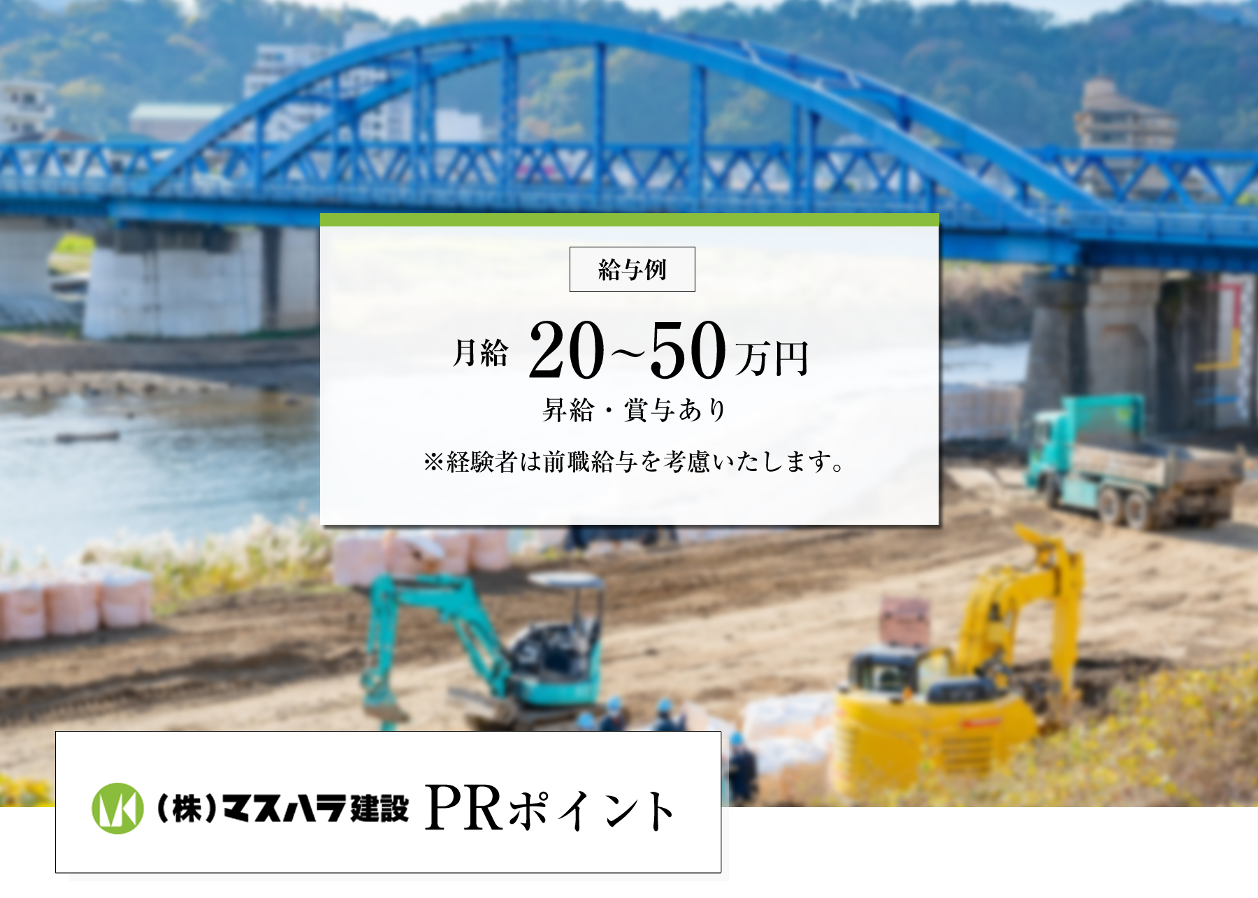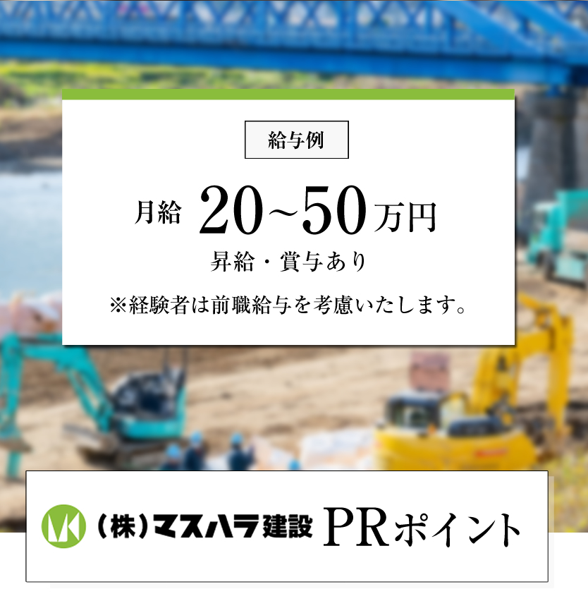 マスハラ建設は、土木・造成工事を始め、様々な建設工事を主力業務としている会社です。 この度、業務拡大に伴い新たなスタッフの募集を行うこととなりました。 経験の有無や年齢を問わず広く募集しているため、地元地域で働きたい方、ご興味がある方は、お気軽にご応募ください。教育体制も整っており、一から丁寧に指導を行います。また、経験、資格があれば給与も最大50万円まで上がるのでしっかり稼ぐ事も可能です!